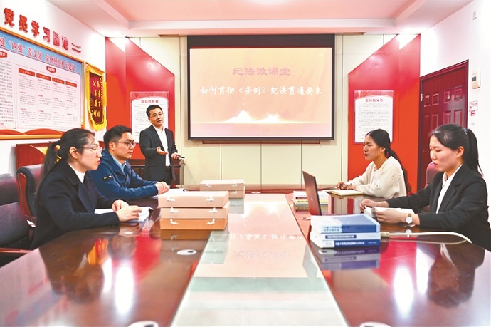 江西省新余市紀(jì)委監(jiān)委不斷強(qiáng)化紀(jì)檢監(jiān)察干部對(duì)執(zhí)紀(jì)執(zhí)法貫通理念的理解運(yùn)用,建立“通報(bào)講評(píng)”機(jī)制,針對(duì)實(shí)踐中發(fā)現(xiàn)的難點(diǎn)問(wèn)題及時(shí)分析講解,提升案件辦理質(zhì)效。圖為該市紀(jì)委監(jiān)委案件審理室圍繞新修訂的紀(jì)律處分條例,解讀紀(jì)法銜接條款的理解運(yùn)用。黃磊 攝