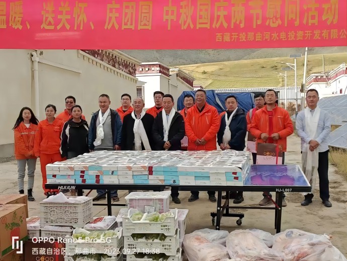 9月27日,西藏開投那曲河水電開發(fā)投資有限公司組織開展送溫暖、送關(guān)懷、慶團(tuán)圓中秋國慶兩節(jié)慰問活動(dòng),集團(tuán)公司副總經(jīng)理尼瑪出席活動(dòng),那曲河公司總經(jīng)理何驍及其它相關(guān)人員參加。