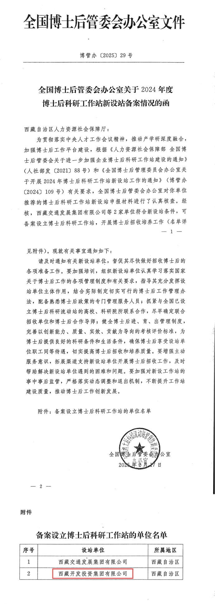 近日,全國博士后管委會辦公室公布了《關于2024年度博士后科研工作站新設站備案情況的函》,西藏開投集團成功獲批設立博士后科研工作站,標志著集團在科技創(chuàng)新和人才培養(yǎng)方面邁上新臺階,將為推進集團清潔能源產(chǎn)業(yè)高質(zhì)量發(fā)展注入強勁動力。