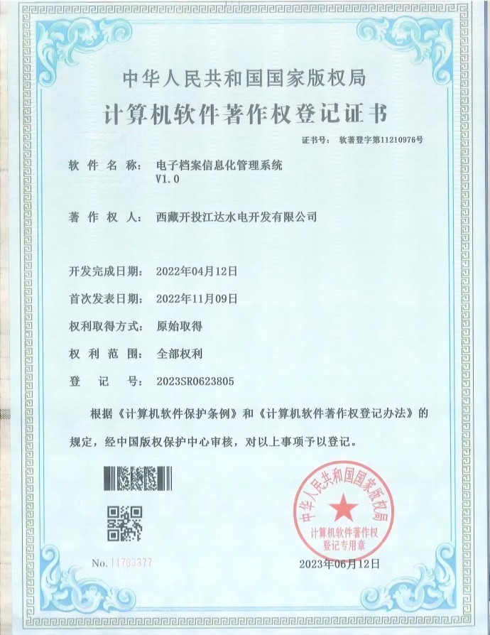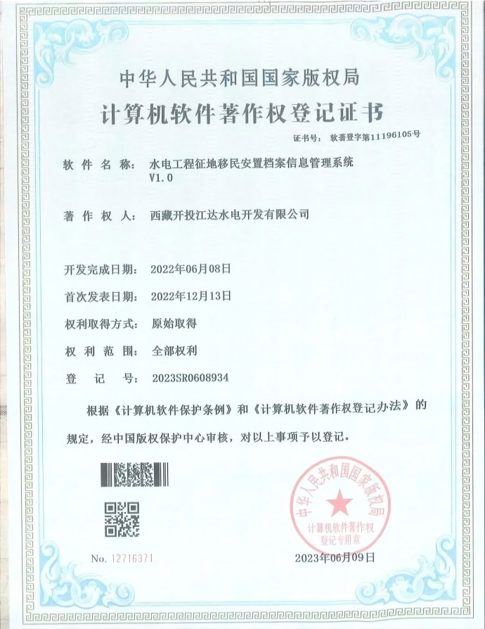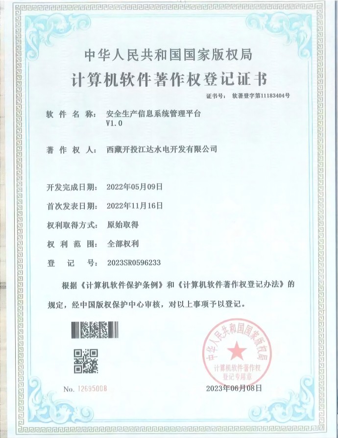 近日,經(jīng)中國版權(quán)保護(hù)中心審核,集團(tuán)公司所屬項目公司申報的三項軟件著作權(quán)符合《計算機軟件保護(hù)條例》和《計算機軟件著作權(quán)登記辦法》的相關(guān)規(guī)定,被正式授予計算機軟件著作權(quán)登記證書。本次取得證書的3項軟件分別是“安全生產(chǎn)信息系統(tǒng)管理平臺V1.0”“電子檔案信息化管理系統(tǒng)V1.0”“水電工程征地移民安置檔案信息管理系統(tǒng)V1.0”。