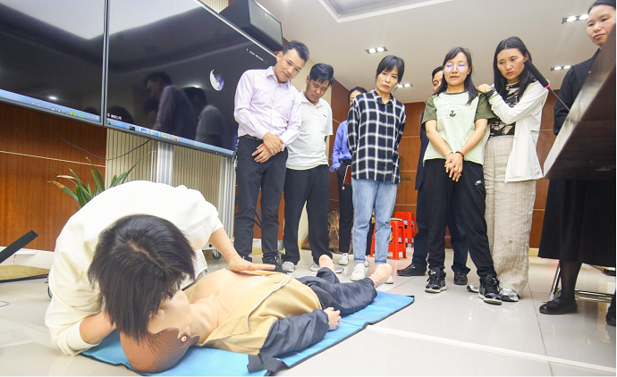 培訓(xùn)過程中,導(dǎo)師通過示范指導(dǎo)、疑問解答、模擬訓(xùn)練等方式,著重演示了海姆立克急救法、心肺復(fù)蘇操作、防震減災(zāi)地震自救以及創(chuàng)傷救護(hù)等現(xiàn)場救護(hù)操作方法,著重強(qiáng)調(diào)了應(yīng)急救護(hù)“黃金四分鐘”及心肺復(fù)蘇胸外按壓的至關(guān)重要性,全體參訓(xùn)人員在導(dǎo)師的指導(dǎo)下對(duì)所學(xué)項(xiàng)目進(jìn)行模擬練習(xí),對(duì)不規(guī)范的流程與動(dòng)作,進(jìn)行糾正,確保參訓(xùn)人員真正掌握應(yīng)急救護(hù)技術(shù)。