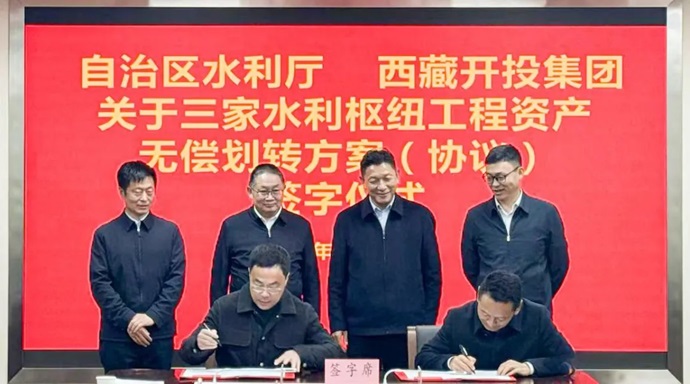 12月11日,自治區(qū)水利廳與西藏開投集團在拉薩簽署旁多、滿拉、拉洛三大水利樞紐工程資產(chǎn)無償劃轉協(xié)議,標志著西藏國有企業(yè)改革邁出堅實步伐。自治區(qū)水利廳黨組副書記、廳長和忠華,區(qū)政府國資委黨委委員、副主任于雷,西藏開投集團黨委書記、董事長祁騰武出席簽字儀式并講話。自治區(qū)水利廳黨組成員、副廳長趙輝與西藏開投集團黨委委員、副總經(jīng)理尼瑪代表雙方簽署協(xié)議。集團領導羅布次仁、陳焱罡出席儀式。