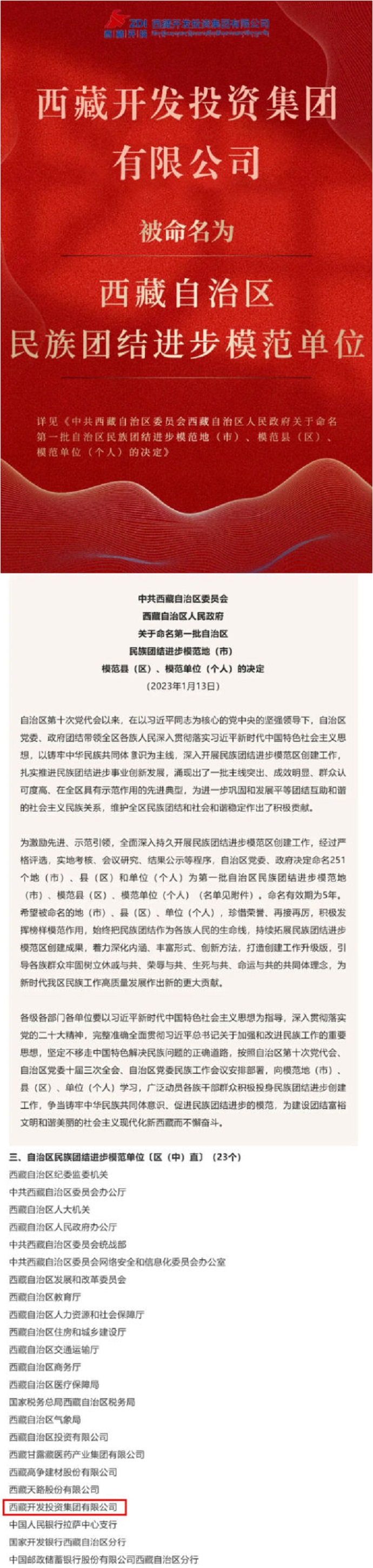 捷報傳來 _ 西藏開投集團被命名為“西藏自治區(qū)民族團結(jié)進步模范單位”