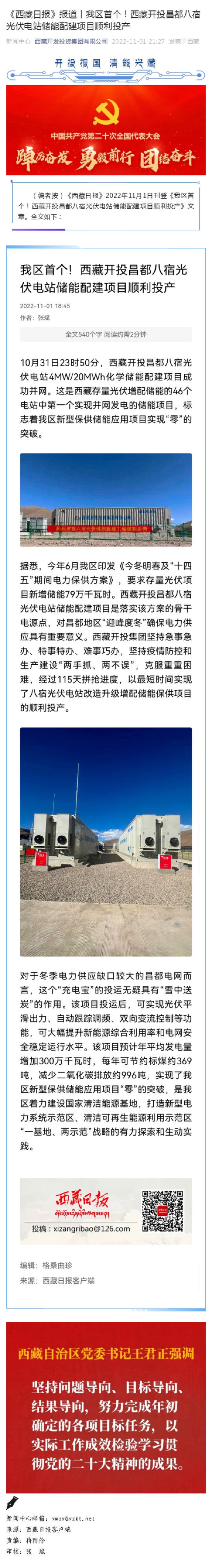 《西藏日?qǐng)?bào)》報(bào)道丨我區(qū)首個(gè)!西藏開(kāi)投昌都八宿光伏電站儲(chǔ)能配建項(xiàng)目順利投產(chǎn)