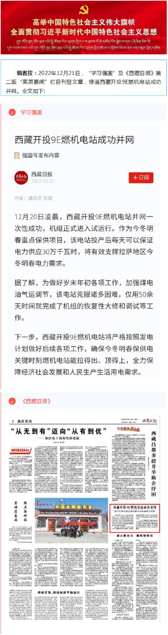 “學(xué)習(xí)強國”、《西藏日報》報道西藏開投9E燃機電站成功并網(wǎng)