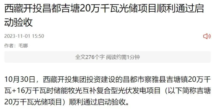 人民網(wǎng)、中國西藏新聞網(wǎng)、西藏日報(bào)客戶端報(bào)道了《西藏開投昌都吉塘20萬千瓦光儲(chǔ)項(xiàng)目順利通過啟動(dòng)驗(yàn)收》