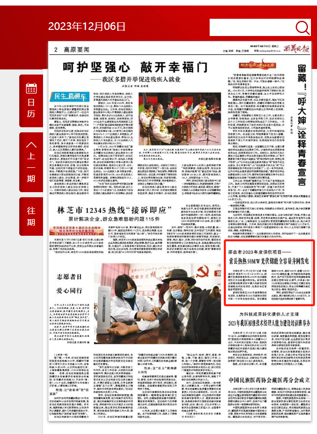 編者按:12月5日,西藏日報(bào)第二版高原要聞欄目報(bào)道了《那曲市2023年度保供項(xiàng)目—索縣熱熱50MW光伏儲(chǔ)能全容量并網(wǎng)發(fā)電》文章。全文如下: