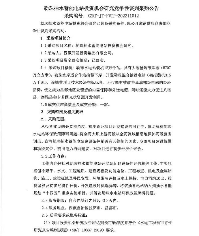 勒珠抽水蓄能電站投資機(jī)會(huì)研究競(jìng)爭(zhēng)性談判采購公告