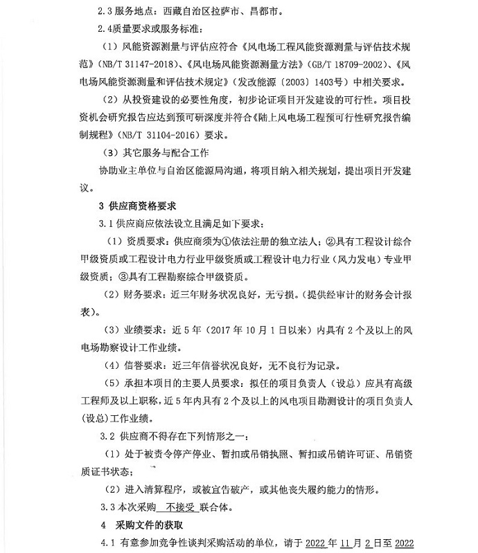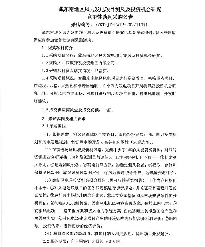 藏東南風(fēng)力發(fā)電項目測風(fēng)和投資機(jī)會研究競爭性談判采購公告