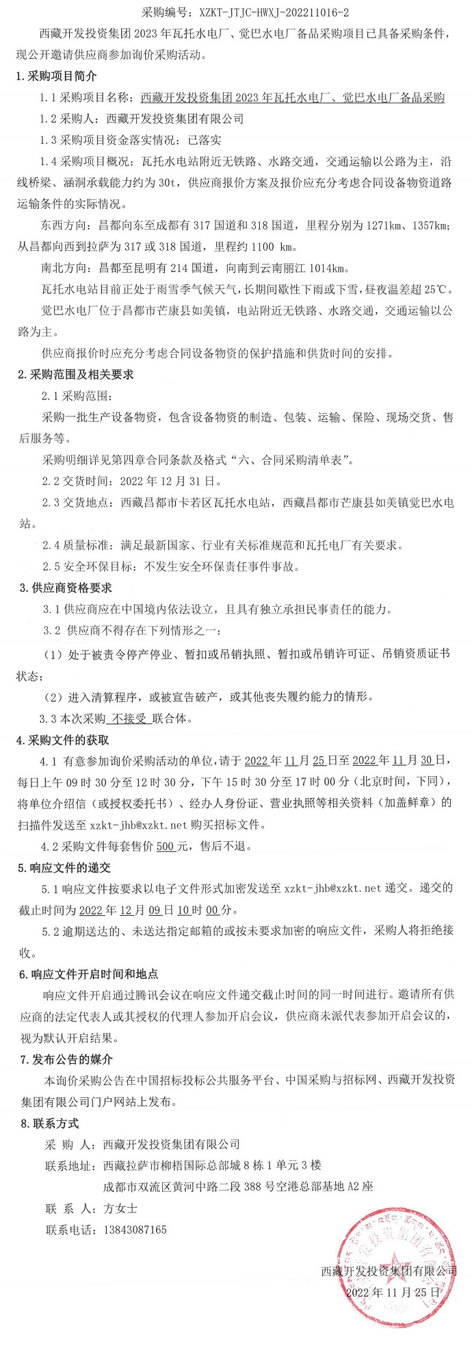 西藏開發(fā)投資集團(tuán)2023年瓦托水電廠、覺巴水電廠備品