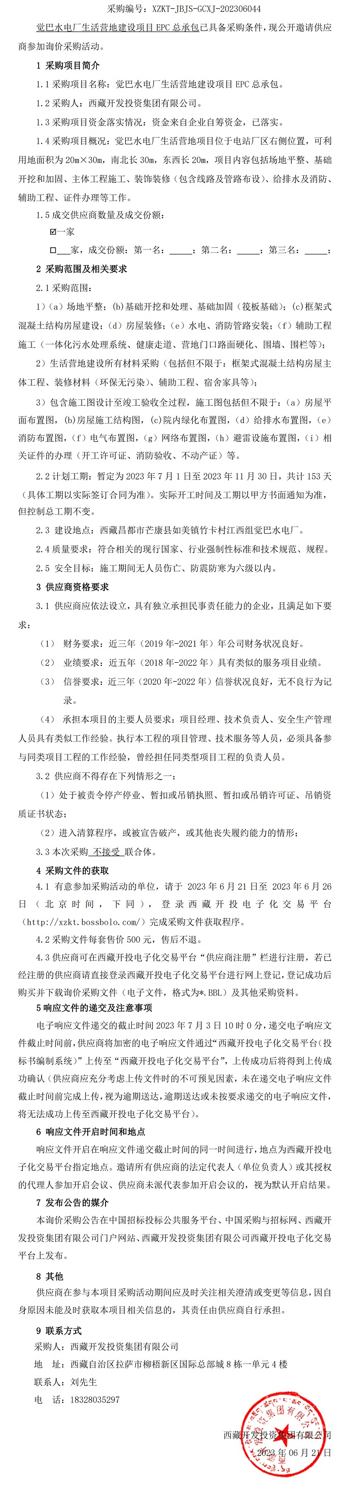 覺巴水電廠生活營地建設(shè)項(xiàng)目EPC總承包詢價采購公告