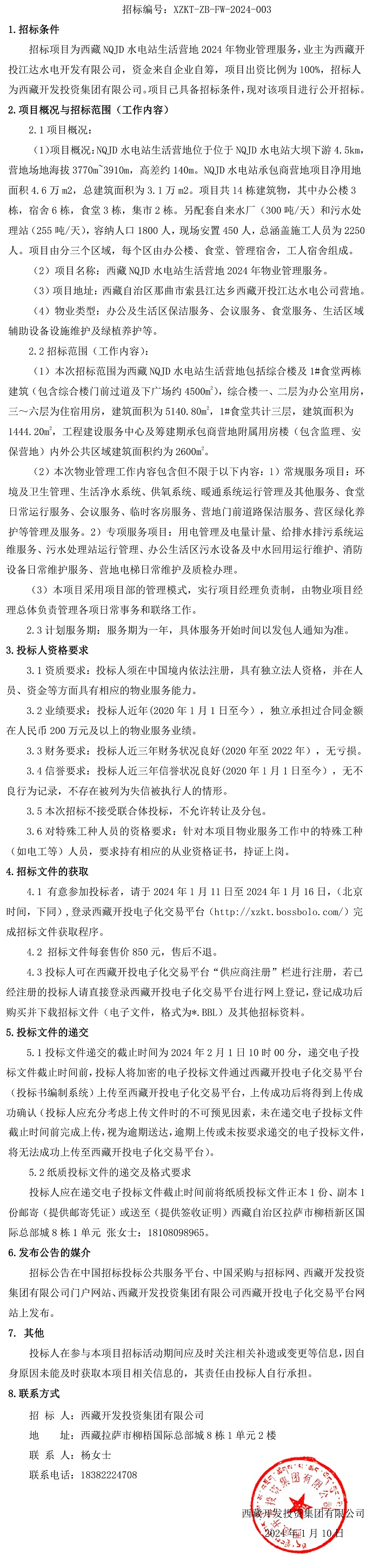 西藏 NQJD 水電站生活營地 2024 年物業(yè)管理服務(wù)招標公告