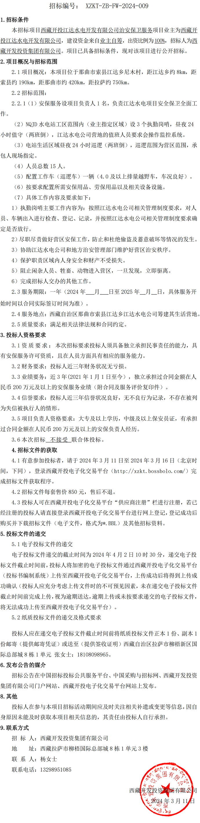 西藏開投江達(dá)水電開發(fā)有限公司安保服務(wù)招標(biāo)公告