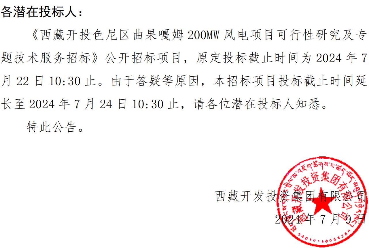 關(guān)于延長(zhǎng)《西藏開投色尼區(qū)曲果嘎姆200MW風(fēng)電項(xiàng)目可行性研究及專題技術(shù)服務(wù)招標(biāo)》投標(biāo)截止時(shí)間的公告