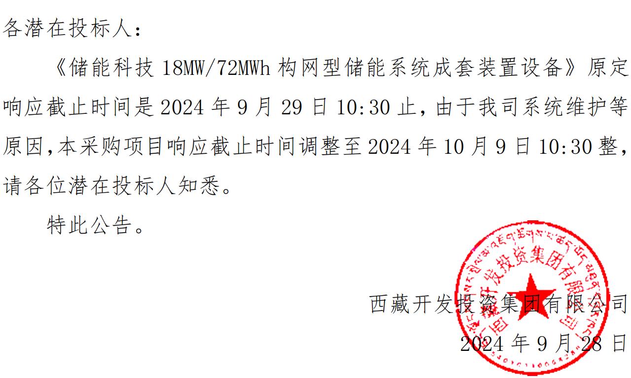 關于延長《儲能科技 18MW/72MWh 構網型儲能系統(tǒng)成套裝置設備》競爭性談判采購響應截止時間的公告