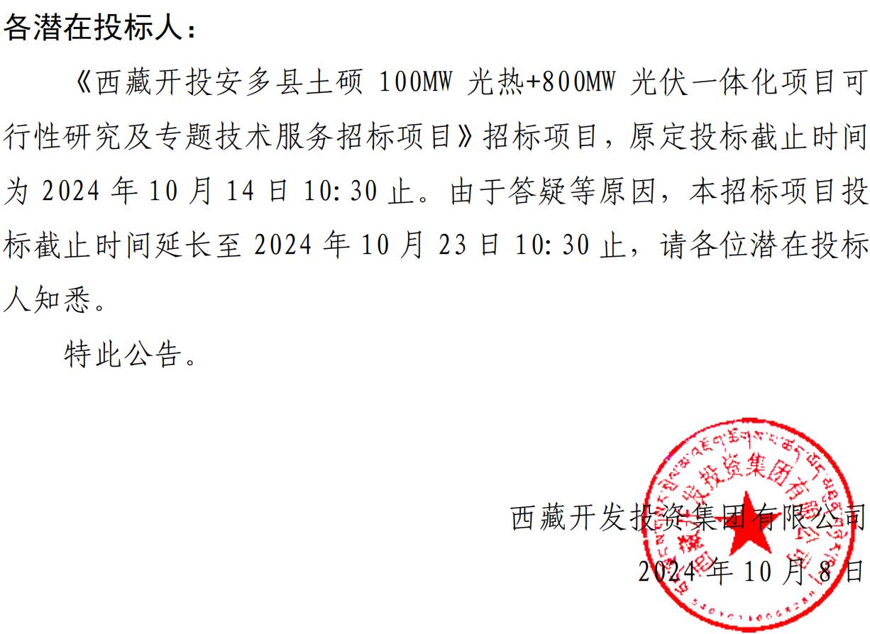 關(guān)于延長《西藏開投安多縣土碩 100MW光熱+800MW 光伏一體化項(xiàng)目可行性研究及專題技術(shù)服務(wù)招標(biāo)項(xiàng)目》投標(biāo)截止時(shí)間的公告