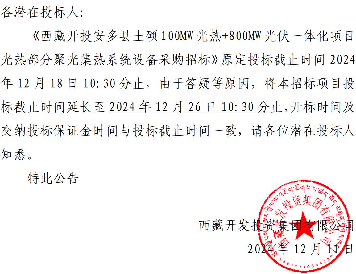 關(guān)于延長《西藏開投安多縣土碩100MW光熱+800MW光伏一體化項目光熱部分聚光集熱系統(tǒng)設(shè)備采購招標(biāo)》投標(biāo)截止時間的公告