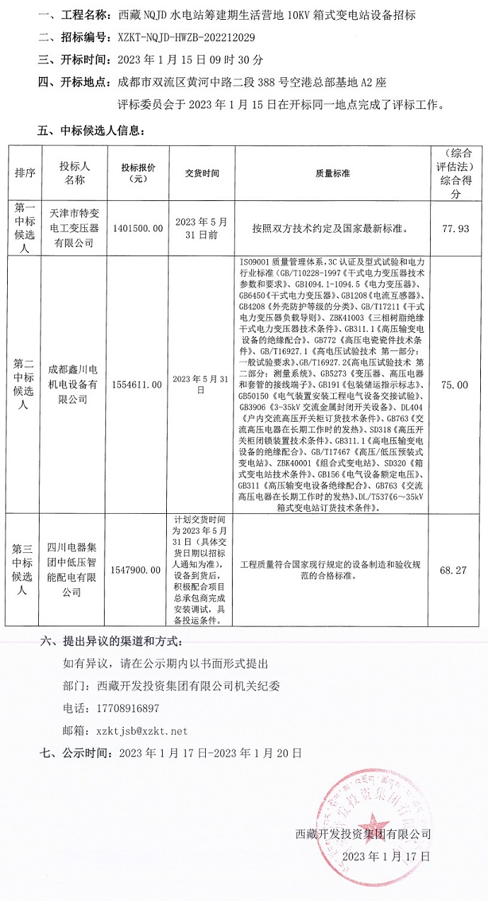 西藏NQJD水電站籌建期生活營地10KV箱式變電站設備招標中標候選人公示